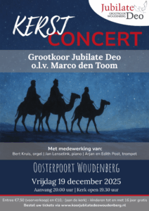 Op D.V. vrijdag 19 december zal het grootkoor Jubilate Deo o.l.v. Marco den Toom een kerstconcert geven in de Oosterpoort in Woudenberg. Verder zullen meewerken: Bert Kruis – orgel, Jan Lenselink – piano, Arjan en Edith Post – trompet. Het concert begint om 20:00 uur en de kerk gaat open om 19:30 uur. Tickets kosten €7,50 in de voorverkoop en €10,- aan de kerk.